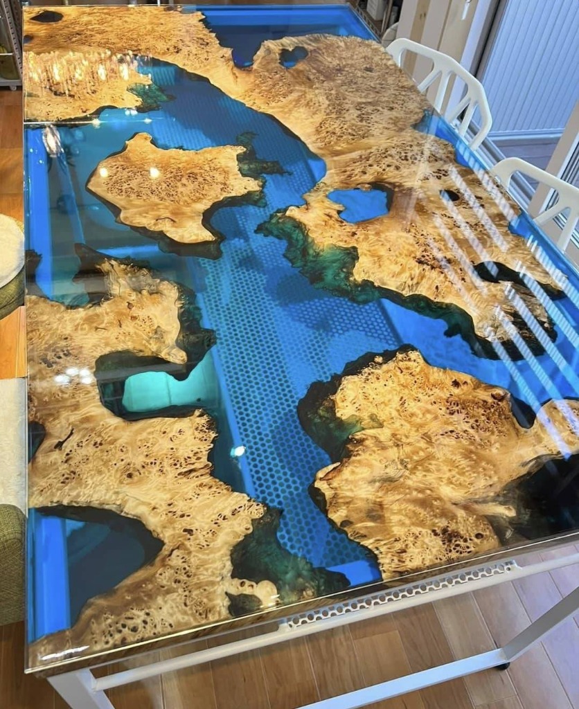 オーダーメイドで制作したレジンテーブルでひと時のお写真を頂きました!リバーテーブルではなく浮島や海をイメージしたデザインにしております。京都府京丹後、宮津市、舞鶴、福知山、豊岡近くの方が見に来ることが多くなってきました^^暖かくなっていたのでお近くまでお越しになられたらレジン作家の作品をどうぞ見に来てください。