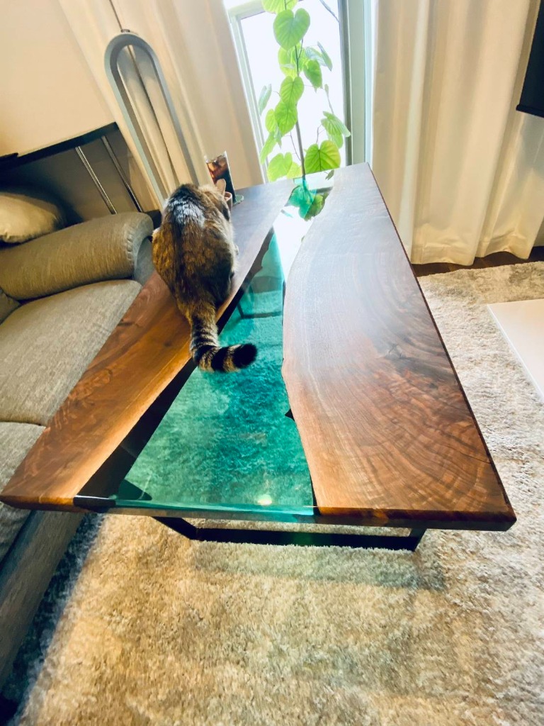木目がくっきりと映し出されたウォールナットを使用したウッドレジンテーブルをオーダーメイドさせていただきました。観葉植物とレジンの緑色がマッチしておりお部屋にが上品でカッコいい空間になってますね...!