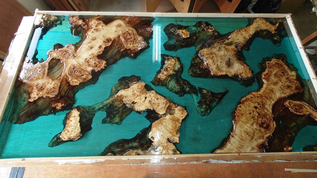 大陸、島にも見える木はまさに地図、オーダーメイドでの制作しておりアートルームに置いていただけるとのことです。レジン作家として大きなお仕事だと思っておりいつも以上に緊張しながらリバーテーブル制作に励んでいます。